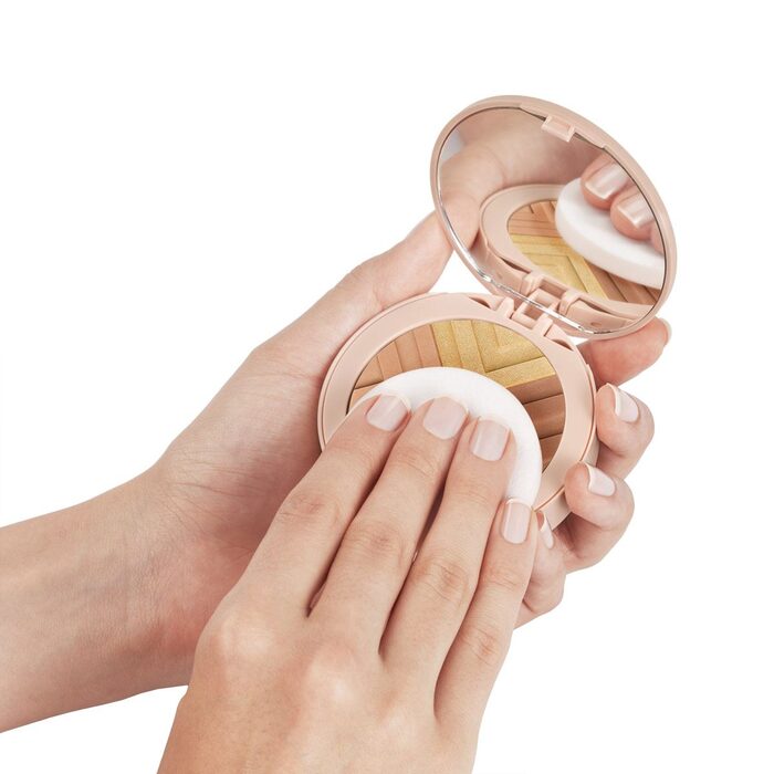 Polvo compacto en mosaico que unifica el tono, matifica y aporta un acabado luminoso natural. Su combinación de tonos ayuda a corregir visualmente imperfecciones y a fijar el maquillaje, dejando la piel con apariencia suave y uniforme. Ideal para retoques durante el día.