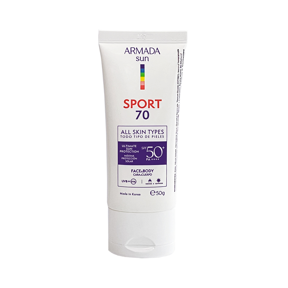 Protector solar facial de alta protección FPS 70, ideal para actividades al aire libre y deporte. Su fórmula resistente al agua y al sudor protege eficazmente contra los rayos UV, ayudando a prevenir el daño solar. Textura ligera que se absorbe fácilmente sin dejar sensación grasosa.